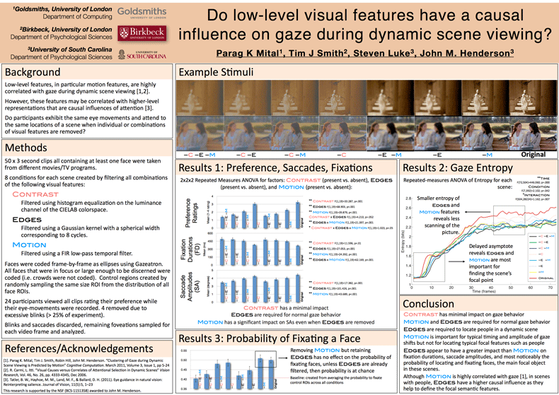 • Robin Hill, John M. Henderson, Parag K. Mital, Tim J. Smith. “Through the eyes of the viewer: Capturing viewer experience of dynamic media.” Invited Poster for SICSA DEMOFest. Edinburgh, U.K. 24 November 2009