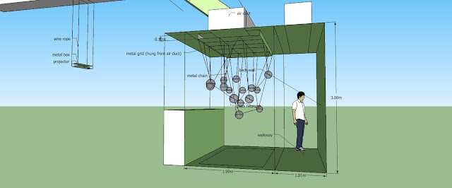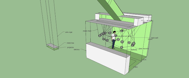 As part of the Kinetica Art Fair 2010, Memory is required to fill in a risk assessment form. This entails listing out all the possibly tragic events that can occur, how many people could potentially die, and a design of the installation as seen from top-down and the side. Having only seen pictures of the space before, deciding on the design was a bit tricky (let alone figuring out how many people would die). The piece itself is not very modular and has to make use of the space (take a look at what I mean). It is basically a web that latches onto whatever it can find in the space. As such, we really needed a nice model of the space in order to model the installation.